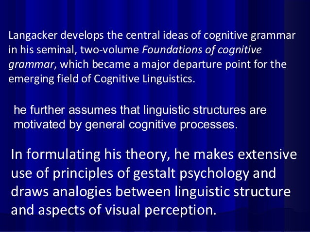Cognitive grammar is a cognitive approach to language developed by Ronald Langacker which considers the basic units of language to be symbols or conventional pairings of a semantic structure with a phonological label. A theory of grammar that seeks to characterize in a psychologically realistic way those structures and abilities that constitute a speakers grasp of linguistic convention and to relate them to other cognitive processes. Cognitive Linguistics grew out of the work of a number of researchers active in the 1970s who were interested in the relation of language and mind and who did not follow the prevailing tendency to explain linguistic patterns by means of appeals to structural properties internal to and specific to language.