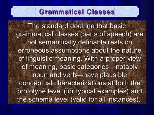 Rather it is an approach that has adopted a common set. Noun A theory of language that seeks to characterize knowledge of grammar in terms of symbolic conceptual and semantic categories and general cognitive processes. Grammar consists of constraints on how these units can be combined to generate larger phrases which are also a pairing of semantics and phonology.