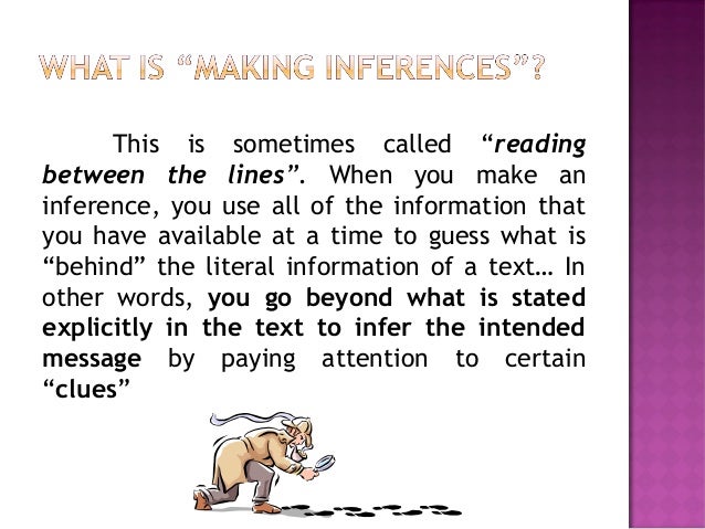 Here the readers or. The ability to make inferences is in simple terms the ability to use two or more pieces of information from a text in order to arrive at a third piece of information that is implicit. Countable That which is inferred.