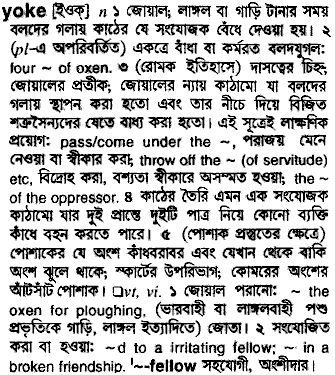 A yoke is a wooden beam normally used between a pair of oxen or other animals to enable them to pull together on a load when working in pairs as oxen usually do. Popularity rank in the US. The introduction attempts to yoke the pieces together.