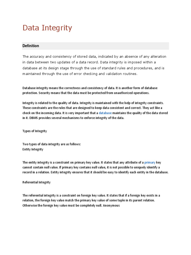 Definition of integrity constraints in dbms. Every time data is entered into that particular column it is evaluated against the constraint and only if the result comes out to be true then the data is inserted into the column. Data integrity is handled in a relational database through the concept of referential integrity. A foreign key is a key whose values are derived from the Primary key of another table.